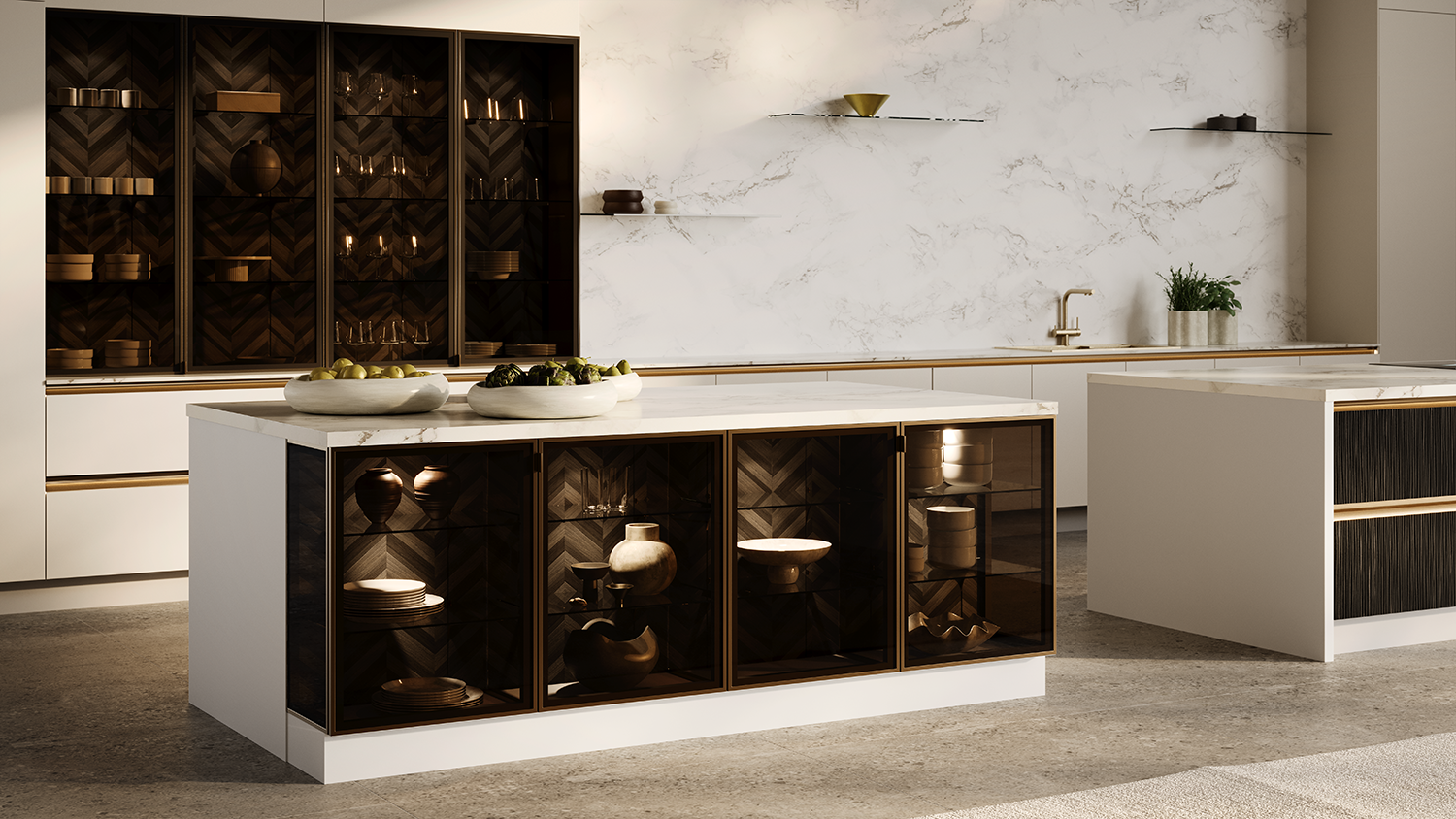 This exclu­sive design­er kitchen com­bines mod­ern kitchen design with pre­mi­um mate­ri­als to cre­ate a styl­ish open-plan liv­ing con­cept. Clean lines, high-qual­i­­ty glass dis­play cab­i­nets and inno­v­a­tive kitchen light­ing with the brushed bronze i‑luminate han­dle pro­file trans­form this open kitchen into a time­less inte­ri­or high­light. A per­fect fusion of archi­tec­ture and liv­ing space.