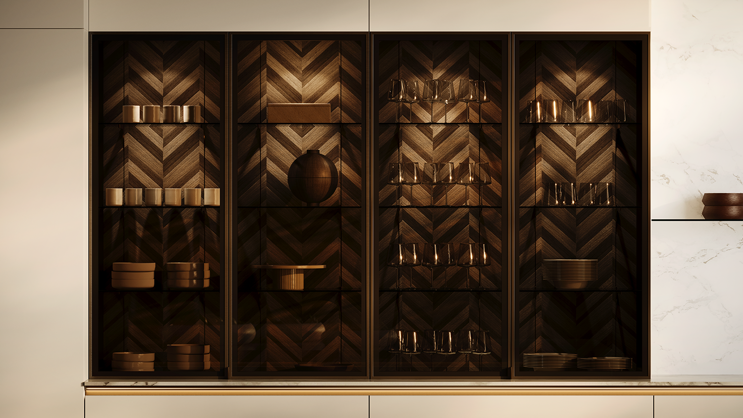 Cette cuisine design exclusive associe lignes modernes et matériaux nobles pour créer un concept raffiné dédié aux espaces de vie ouverts. Lignes épurées, vitrines en verre haut de gamme et éclairage innovant grâce au profil i‑luminate en bronze brossé font de cette cuisine ouverte une pièce maîtresse intemporelle, où l’architecture se fond dans l’art de vivre.